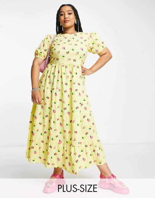 Vestido midi amarillo limón escalonado de corte amplio con estampado frutal y espalda abierta de Neon Rose