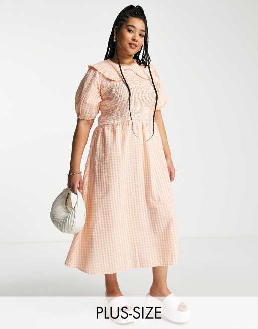 Vestido midi color albaricoque a cuadros vichy con cuerpo fruncido y cuello extragrande de sirsaca de Neon Rose Plus