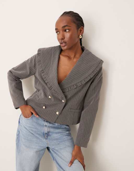 Americana corta gris con raya diplomática brillante y ribete de volantes de Neon Rose