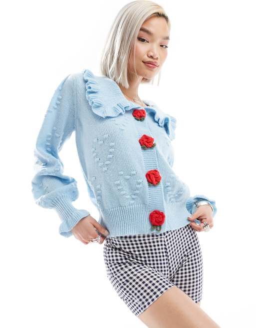 Cárdigan azul pastel de punto pointelle con detalles de rosas de Neon Rose