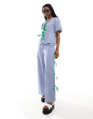 Pantalones a cuadros vichy azules de pernera ancha con detalle de lazos verdes de Neon Rose (parte de un conjunto)
