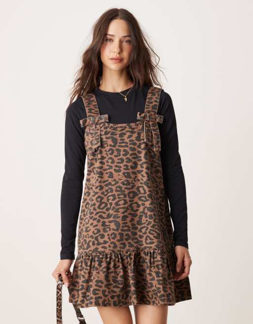 Vestido vaquero marrón estilo pichi con estampado de leopardo de Neon Rose