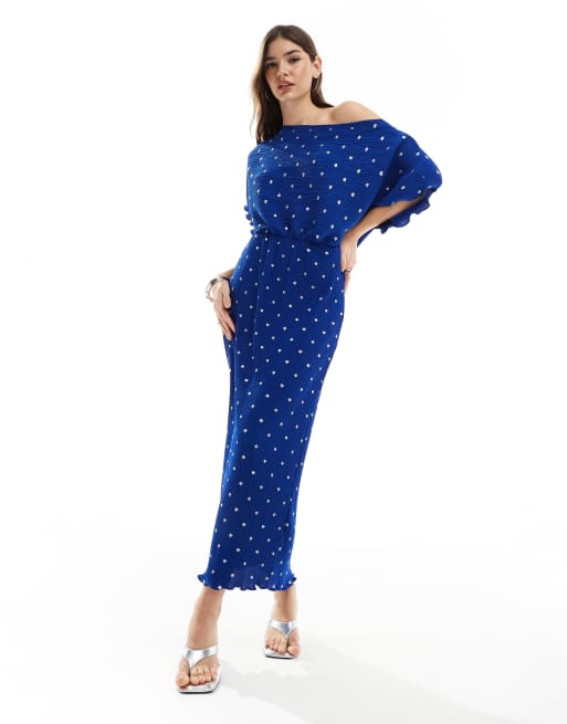 Vestido azul cobalto metalizado plisado con hombro descubierto de Never Fully Dressed