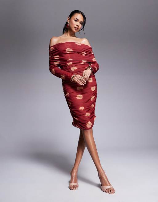 Vestido corto burdeos con escote Bardot fruncido y estampado de corazones de malla de Never Fully Dressed