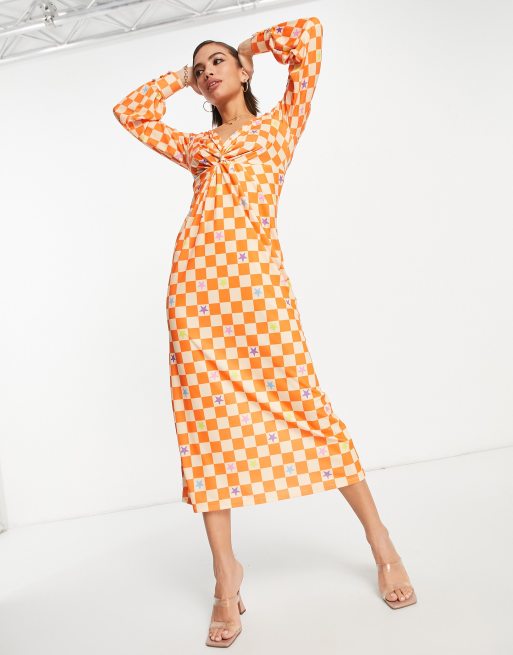 Vestido midi naranja con estampado a cuadros dameros y estrellas de Never Fully Dressed