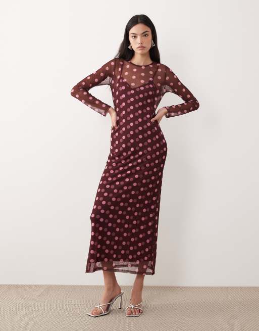 Vestido semilargo marrón chocolate con estampado de lunares de malla de Never Fully Dressed