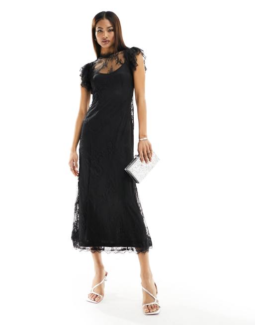 Vestido semilargo negro con mangas acampanadas de encaje transparente de Never Fully Dressed