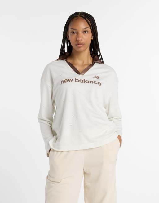 Camiseta blanco hueso de manga larga de malla de punto liso de New Balance