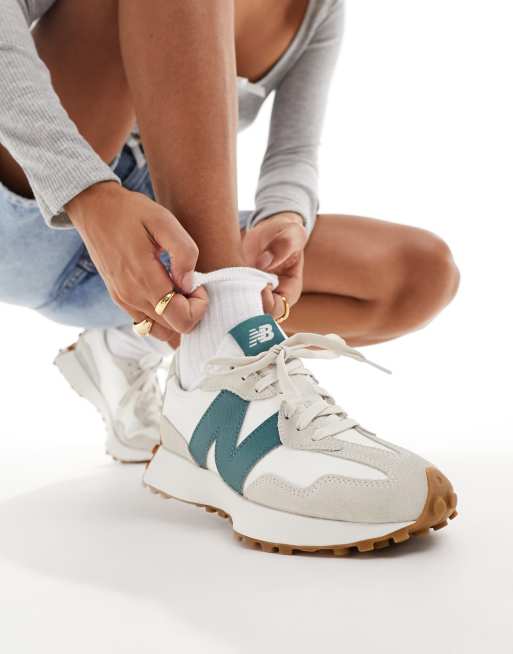 Zapatillas de deporte blancas y verde abeto con suela de goma 327 de New Balance