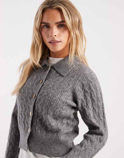 Cárdigan beis grisáceo con cuello de solapas de punto de ochos de New Look Petite