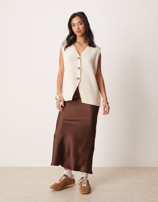 Falda midi marrón de corte al bies de satén de New Look Petite