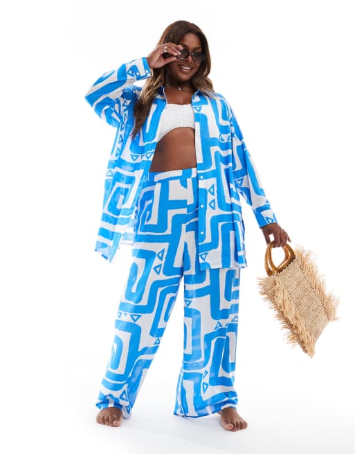 Conjunto playero azul de pantalones y camisa con patrón ondulado de New Look Curve