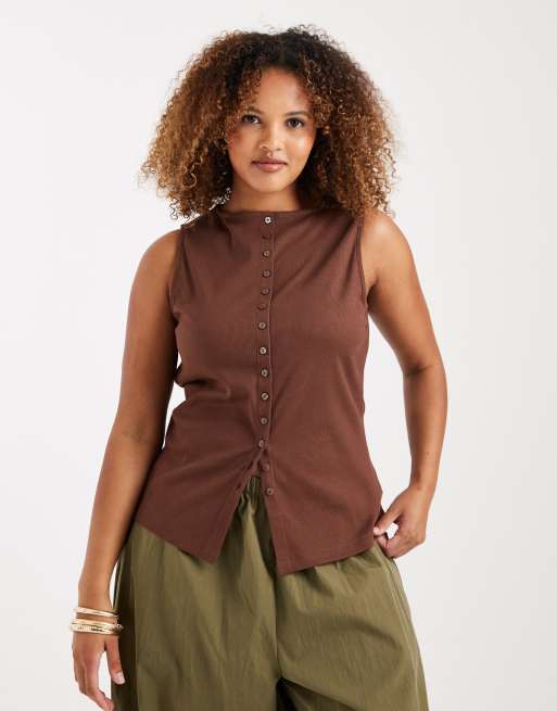 Top marrón oscuro abotonado sin mangas con cuello barco de New Look Curve