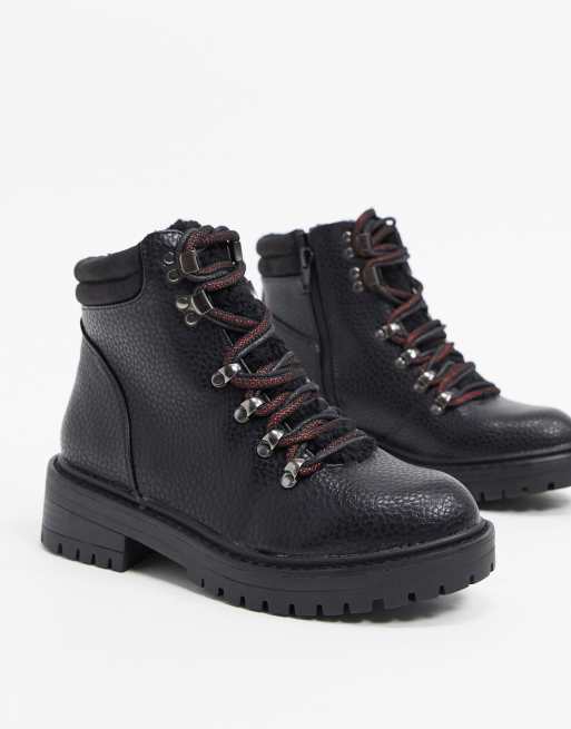 Botas de montaña negras planas con cordones y detalle de borreguito de New Look