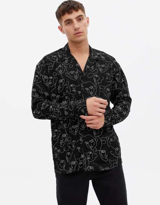Camisa extragrande negra de manga larga con estampado de caras estilo boceto de New Look
