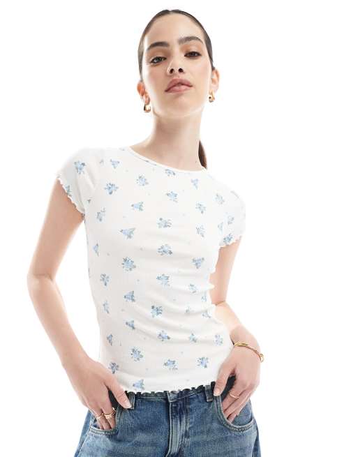 Camiseta blanca con estampado de florecitas y ribetes remallados de New Look