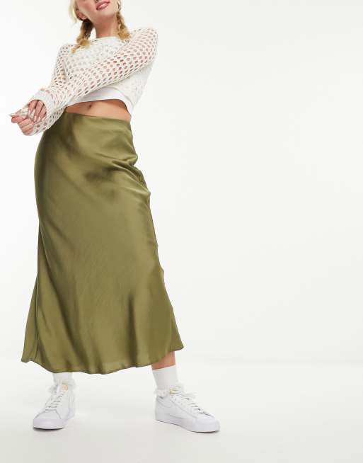 Falda midi caqui de satén cortada al bies de New Look