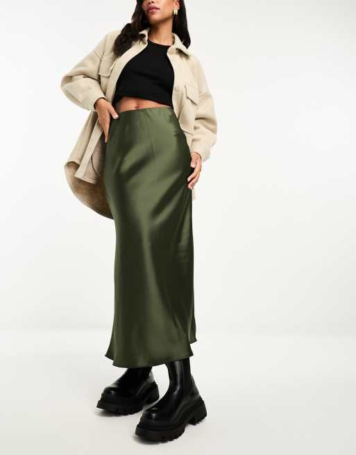 Falda midi caqui de satén de New Look