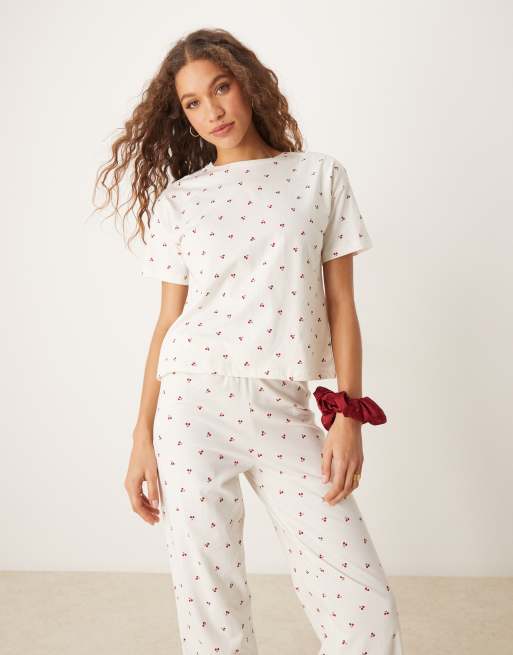 Pijama blanco de pernera ancha con estampado de cerezas de New Look