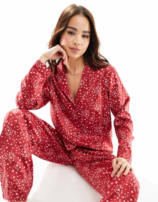 Set rojo de pantalones y camisa con cuello de solapas y estampado de corazones de satén de New Look