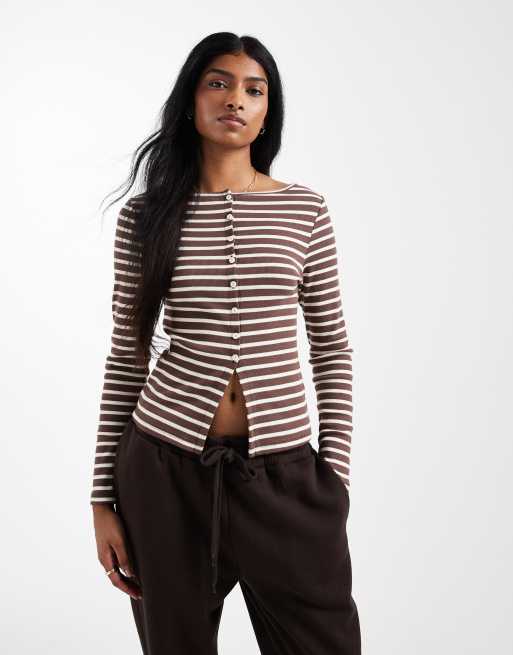 Top marrón a rayas de manga larga con botones de New Look