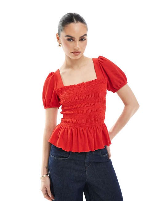 Top rojo con cuerpo fruncido y mangas abullonadas de New Look