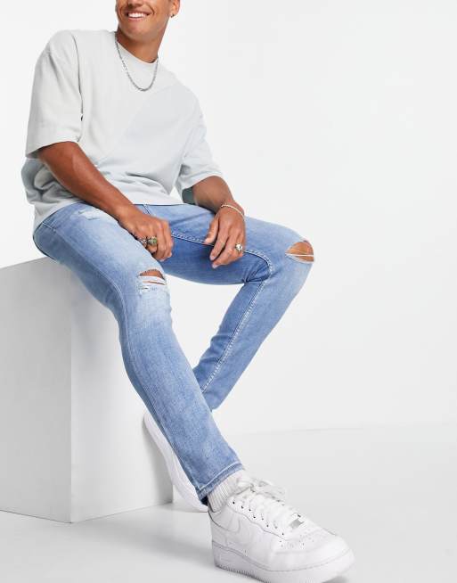 Vaqueros con lavado azul medio de corte pitillo con rotos de New Look