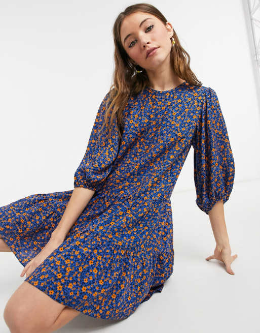 Vestido corto azul amplio con estampado floral y diseño escalonado de New Look