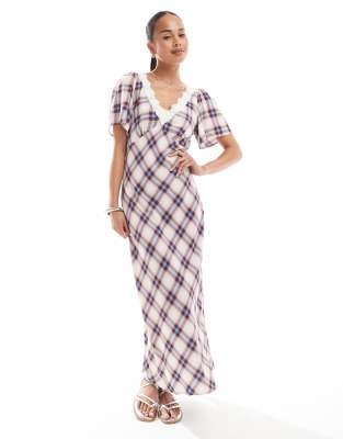 Vestido midi color crema a cuadros con mangas acampanadas y detalle de encaje de New Look