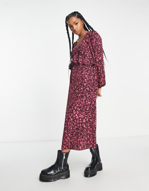 Vestido midi rosa de manga larga con estampado floral y volantes de New Look