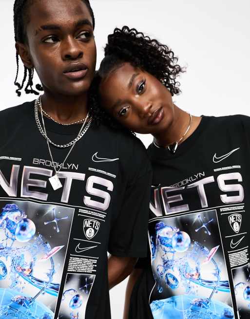 Camiseta negra unisex con estampado gráfico de los Brooklyn Nets de la NBA estilo años 90 de Nike Basketball