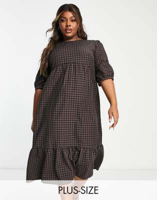 Vestido midi marrón amplio a cuadros con mangas abullonadas Rachel de Nobody's Child Plus