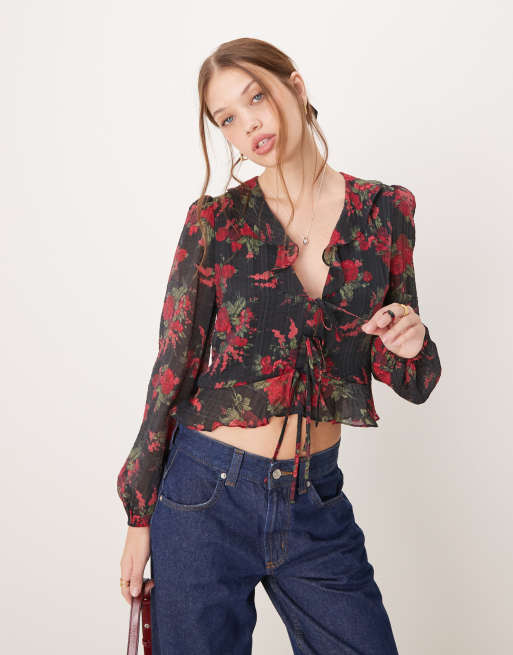 Blusa negra con estampado floral y volante Lotus de Nobody's Child