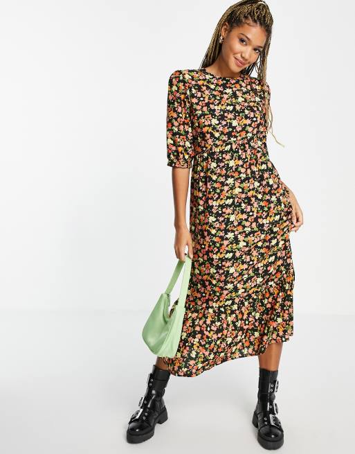 Vestido midi negro con estampado de flores y diseño escalonado de Nobody's Child