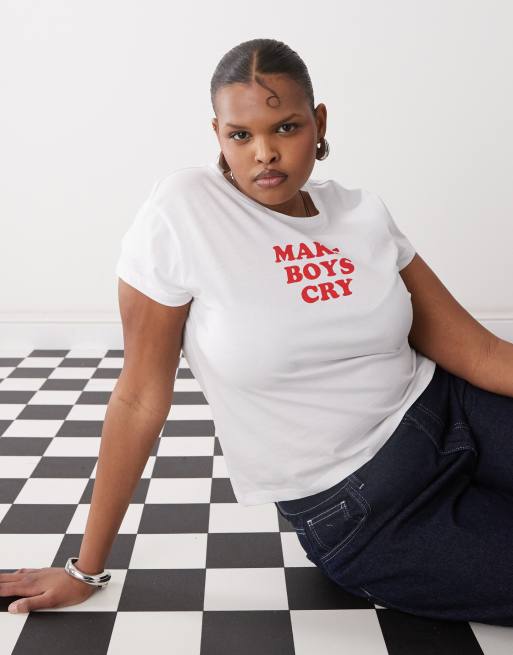 Camiseta blanca con diseño encogido y estampado "Boys Cry" de Noisy May Curve