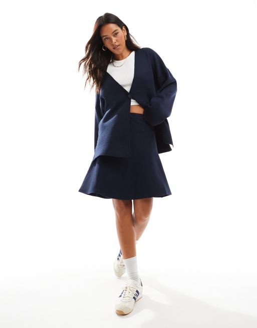 Conjunto de punto azul marino de cárdigan y minifalda de corte skater de Object