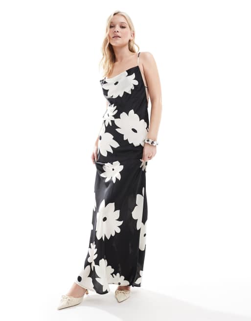 Vestido largo negro con estampado floral y espalda baja con detalle cruzado de satén de Object