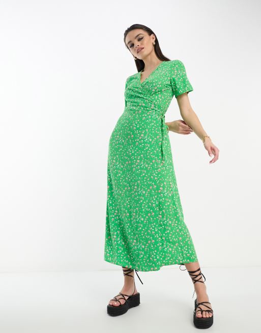Vestido midi verde cruzado con estampado de florecitas de Object