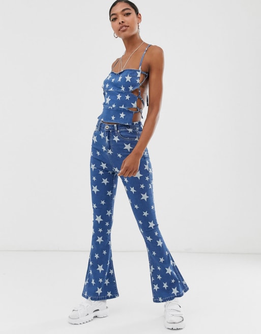 Conjunto vaquero de pantalones de campana y top con tiras y estampado de estrellas de One Above Another