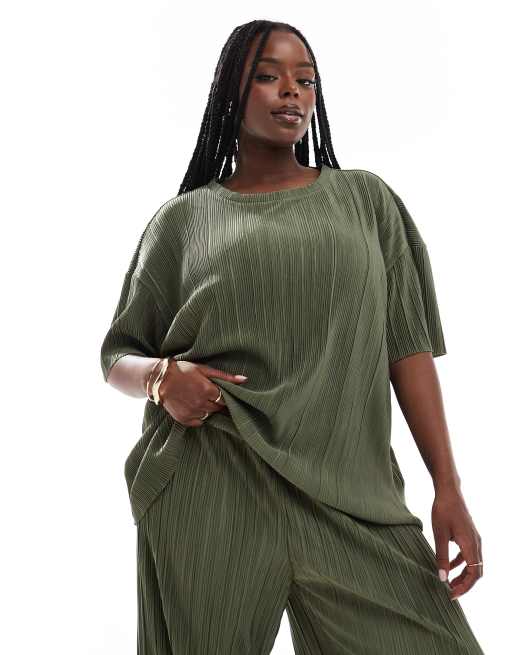 Camiseta caqui plisada de corte cuadrado de ONLY Curve (parte de un conjunto)