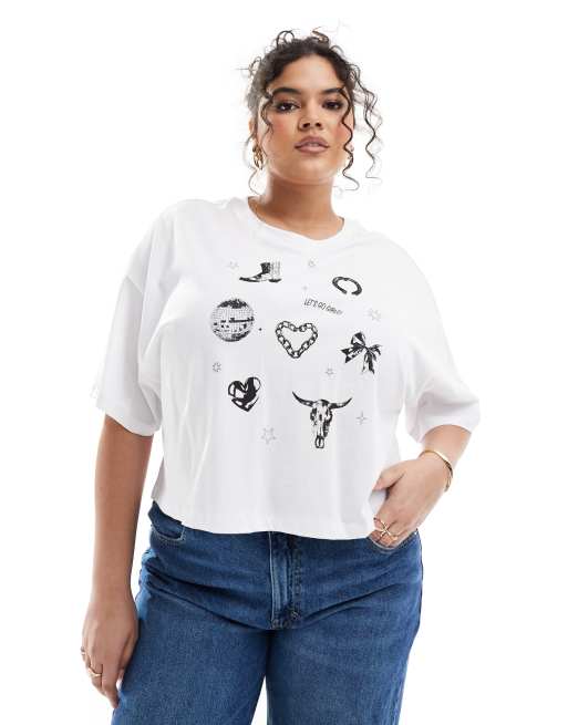 Camiseta corta blanca con estampado gráfico con motivos de vaquera de ONLY Curve
