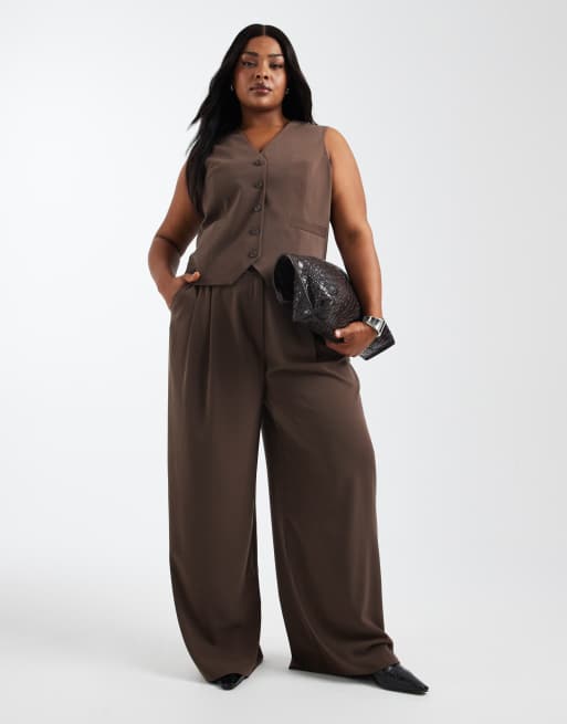 Pantalones de sastre marrón chocolate de pernera ancha de ONLY Curve (parte de un conjunto)