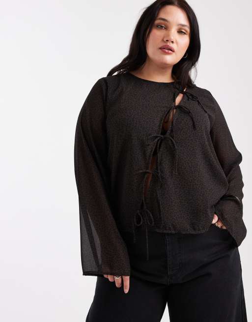 Top marrón con detalle asimétrico con lazadas y estampado de leopardo de ONLY Curve