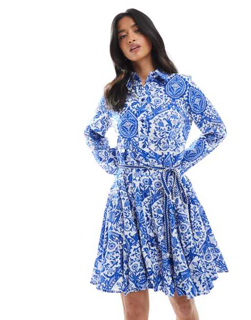 Vestido corto azul con estampado de mosaico, cintura baja y lazada en la cintura de ONLY Petite
