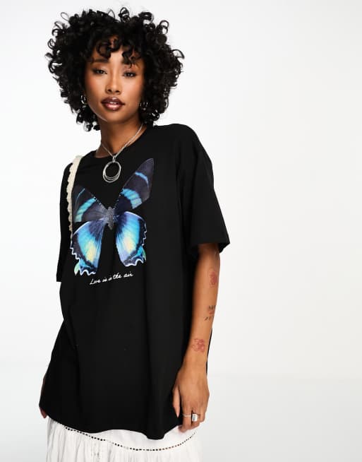 Camiseta negro lavado extragrande con estampado gráfico de mariposa de Only