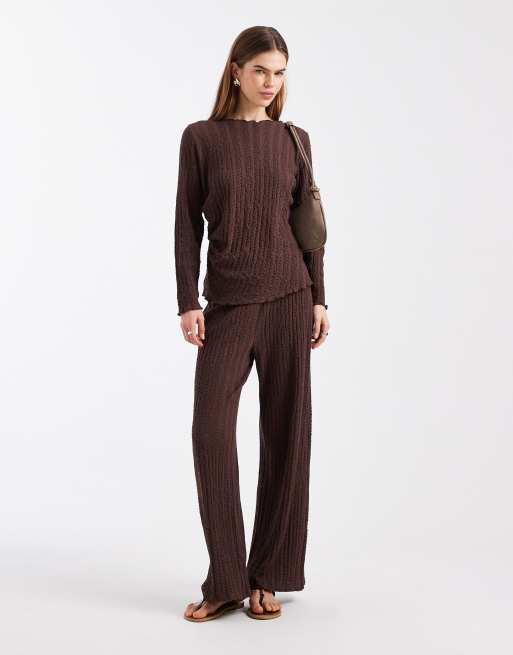 Conjunto marrón chocolate de top de manga larga y pantalones de pernera ancha de tejido texturizado de ONLY