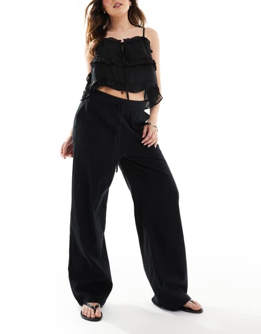 Pantalones negros de pernera ancha de tejido efecto lino de ONLY