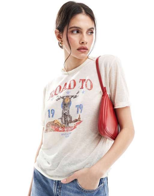 Top beis de corte cuadrado con estampado de carretera y acabado flameado de ONLY
