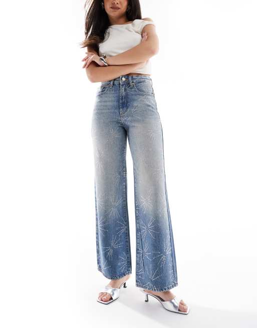 Vaqueros de pernera ancha y talle muy alto con lavado medio y detalle de pedrería Hope de ONLY