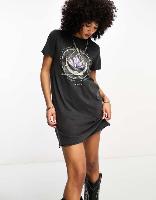 Vestido corto negro lavado estilo camiseta con estampado gráfico de Only